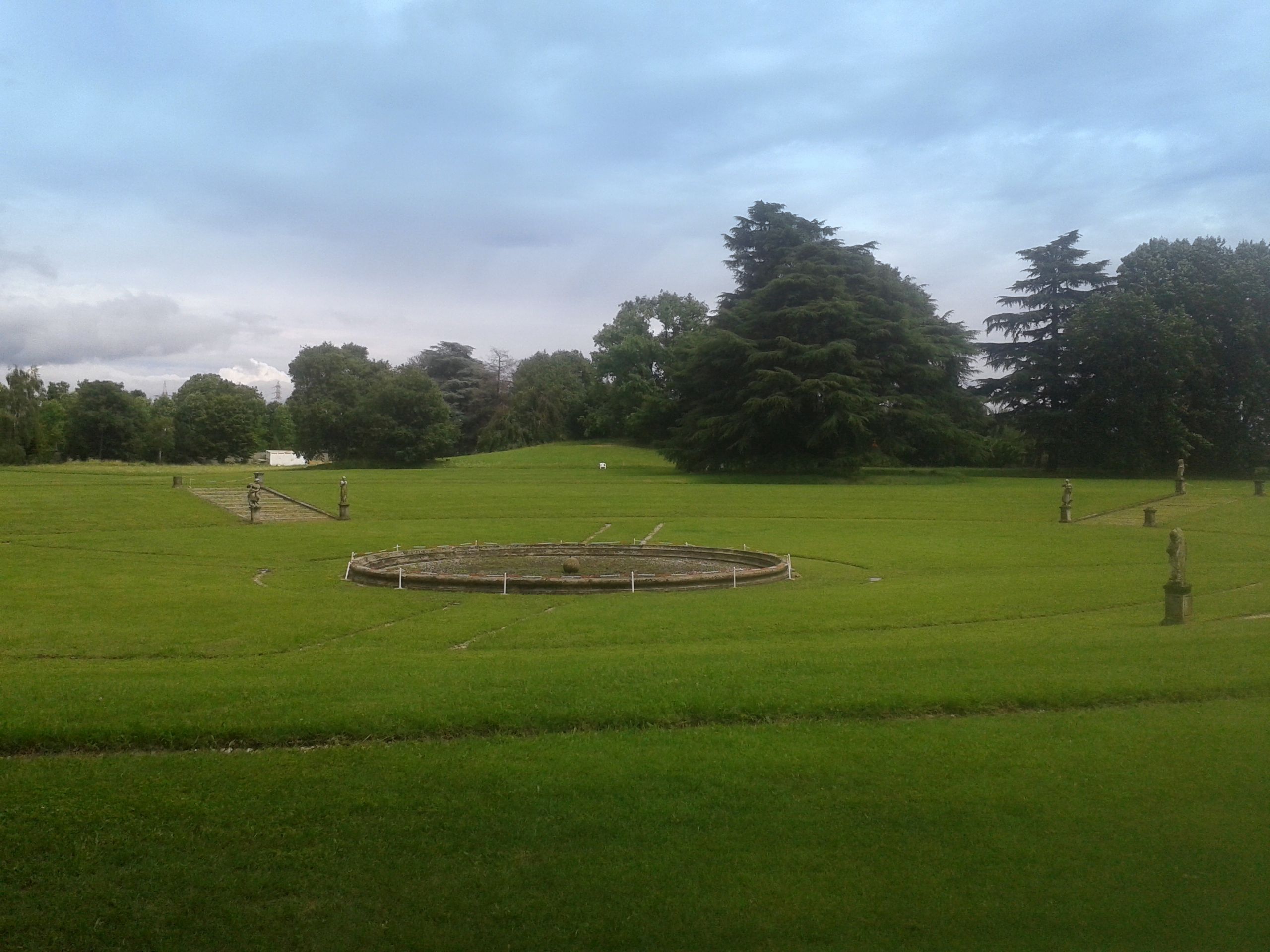 La fontana posta in asse con la villa, il viale e la forma ellittica concava in cui è contenuta, ha la dimensione di 121,38 mq con uno spruzzo centrale.